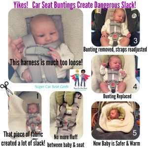 Using buntings inside your car seat can introduce dangerous slack & alter the way your seat was designed to work.  Cutting out the entire portion that goes between your child and their seat mitigates those risks.