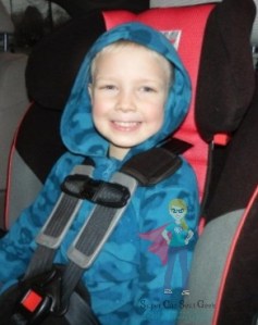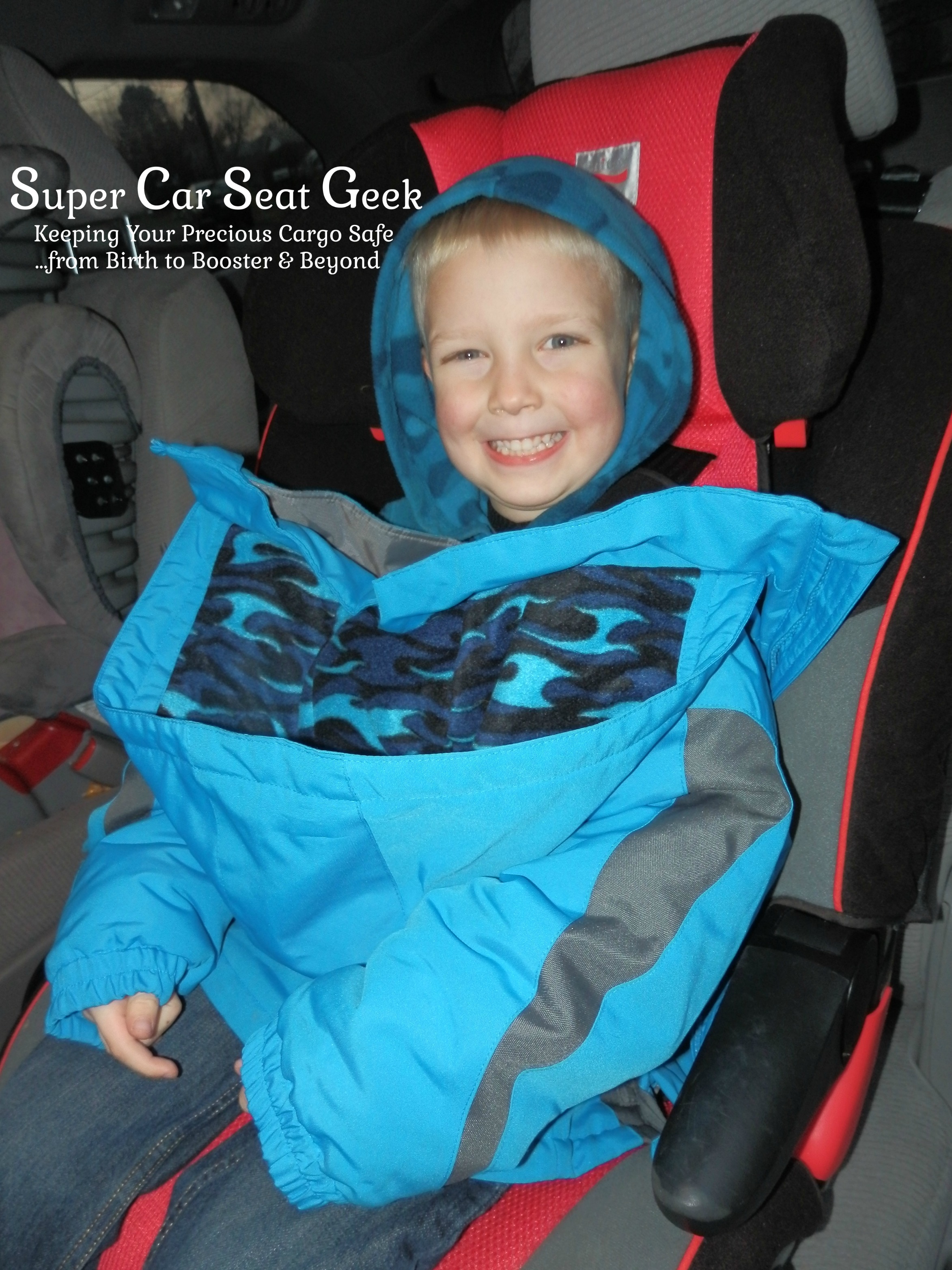The ideas listed above are still perfectly fine to utilize as time goes on.  However, once kids start going to school, a very warm jacket is often needed for outdoor-time.  Sometimes it just makes more sense to have a traditional, thick winter jacket.  While those will continue to be unsafe to wear under a safety restraint, the child can wear it out to the car and remove it prior to buckling up.  The jacket can then be put on backwards, over their harness.