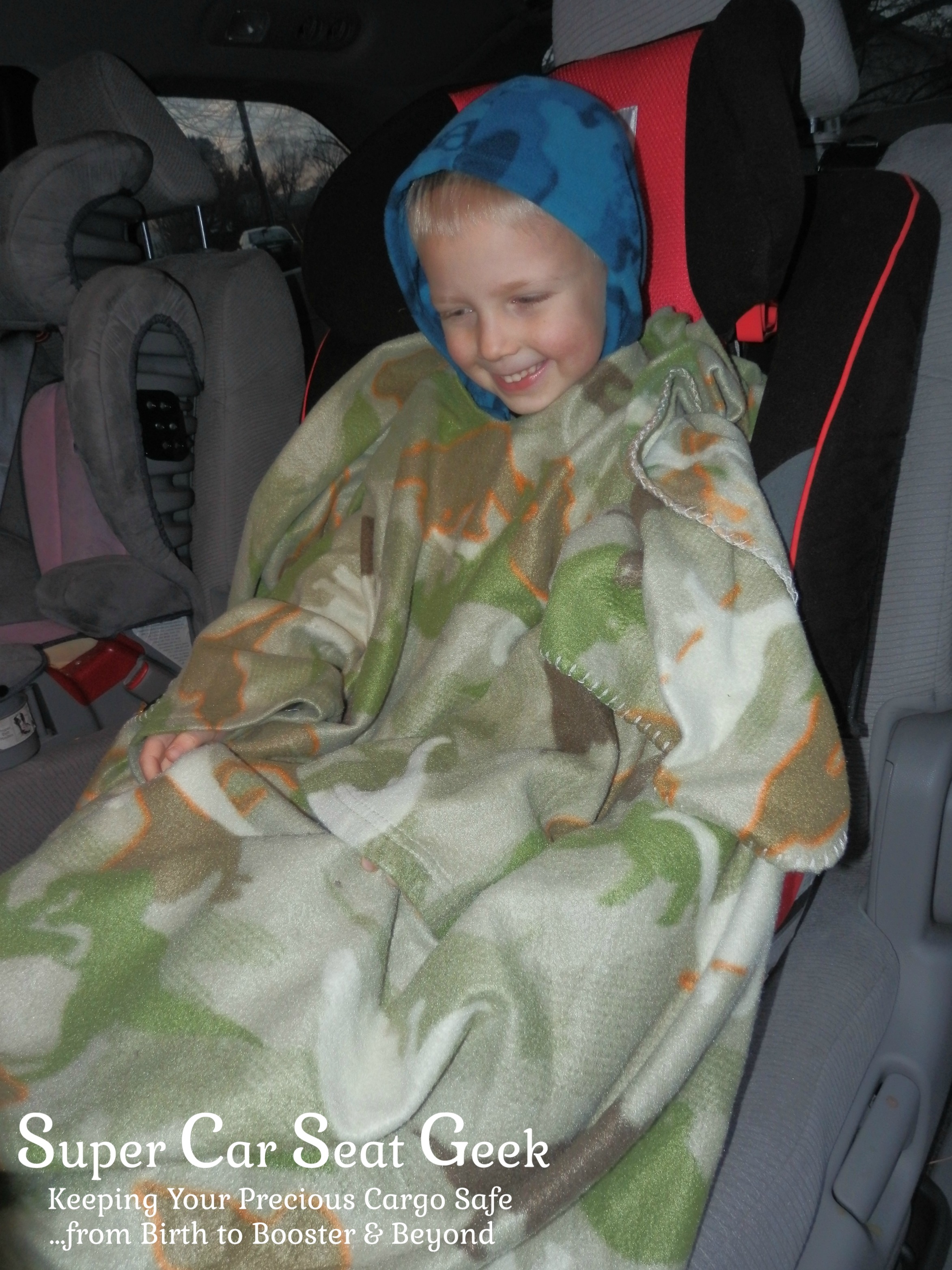 A “wearable blanket” is a great way to keep older kids cozy in the car
