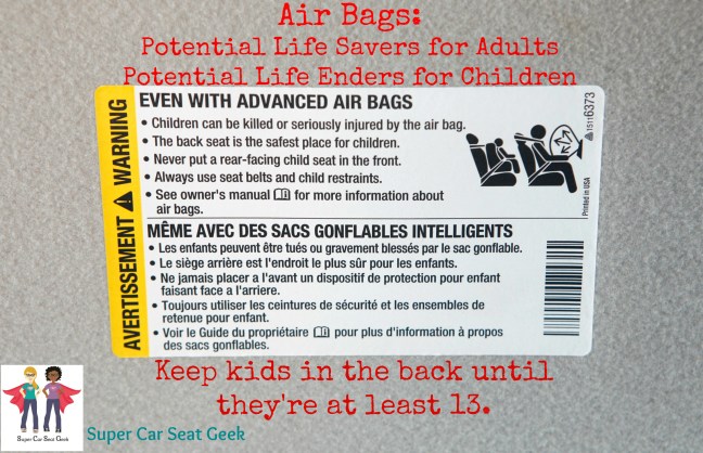 Remember–airbags are designed for adults, not kids. A child sitting in front of an airbag can be seriously hurt or killed (and air bag sensors are *not* reliable!). Kids need to stay in the back seat until they’re at least 13 years old. (And of course, a rear facing seat should never go in front of an active air bag!)